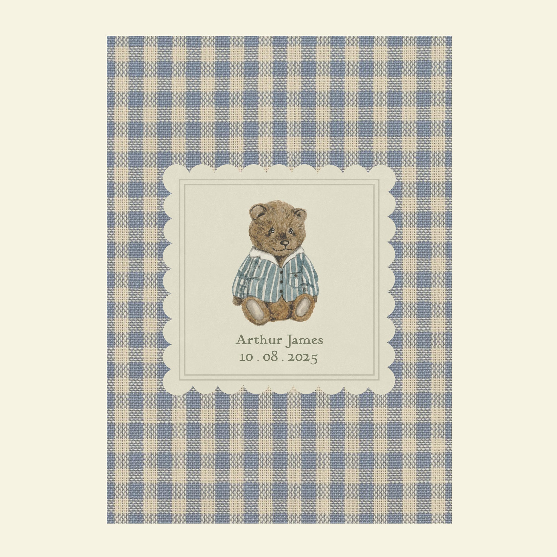 Add a personal touch to your nursery decor with this adorable hand-painted bear with your child's name and date of birth. Featuring a sweet gingham border and scallop detail, this art print would make a beautiful gift for a new baby.