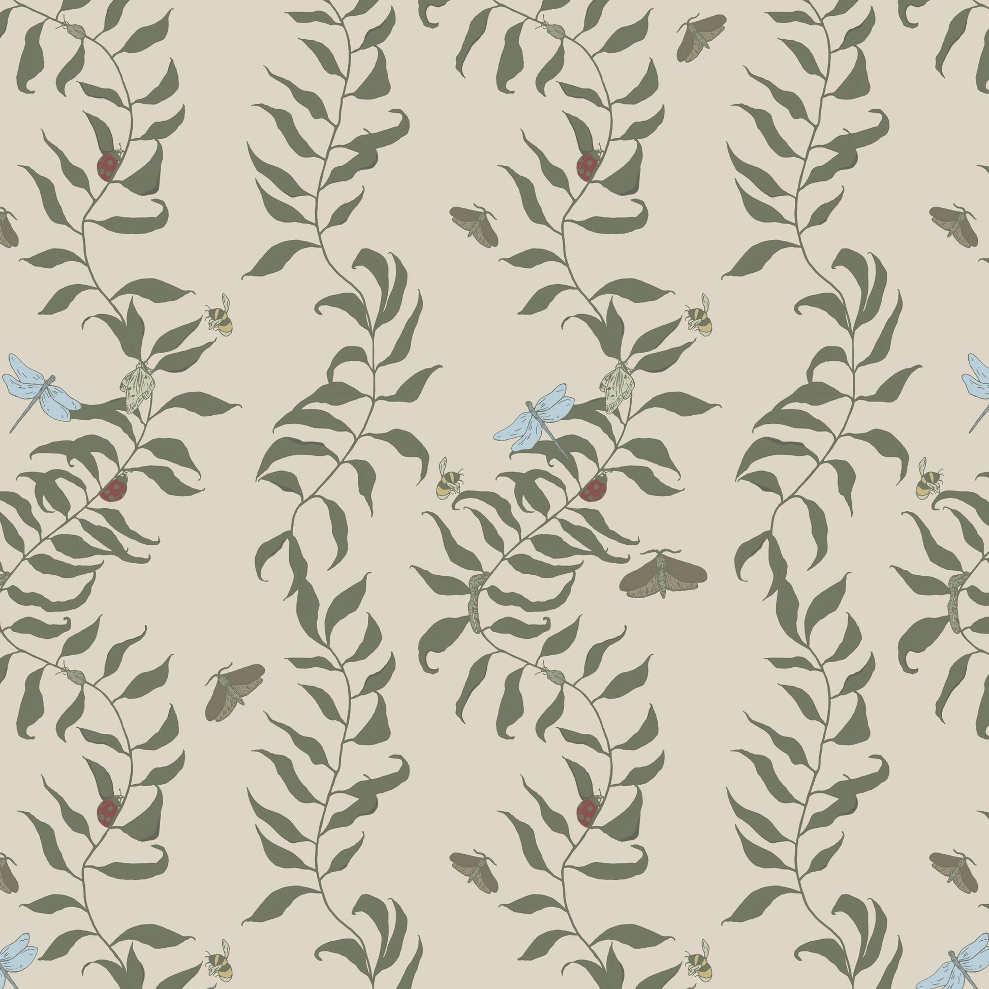 Our 'Bugs in the Willow' Wallpaper is a celebration of natures small wonders, inviting your little one to spot the creatures hidden among the willow leaves. Featuring hand-illustrated trailing willow vines across a neutral linen tone background, dotted with dragonflies, bees,moths and ladybirds, capturing a moment of wild garden stillness.