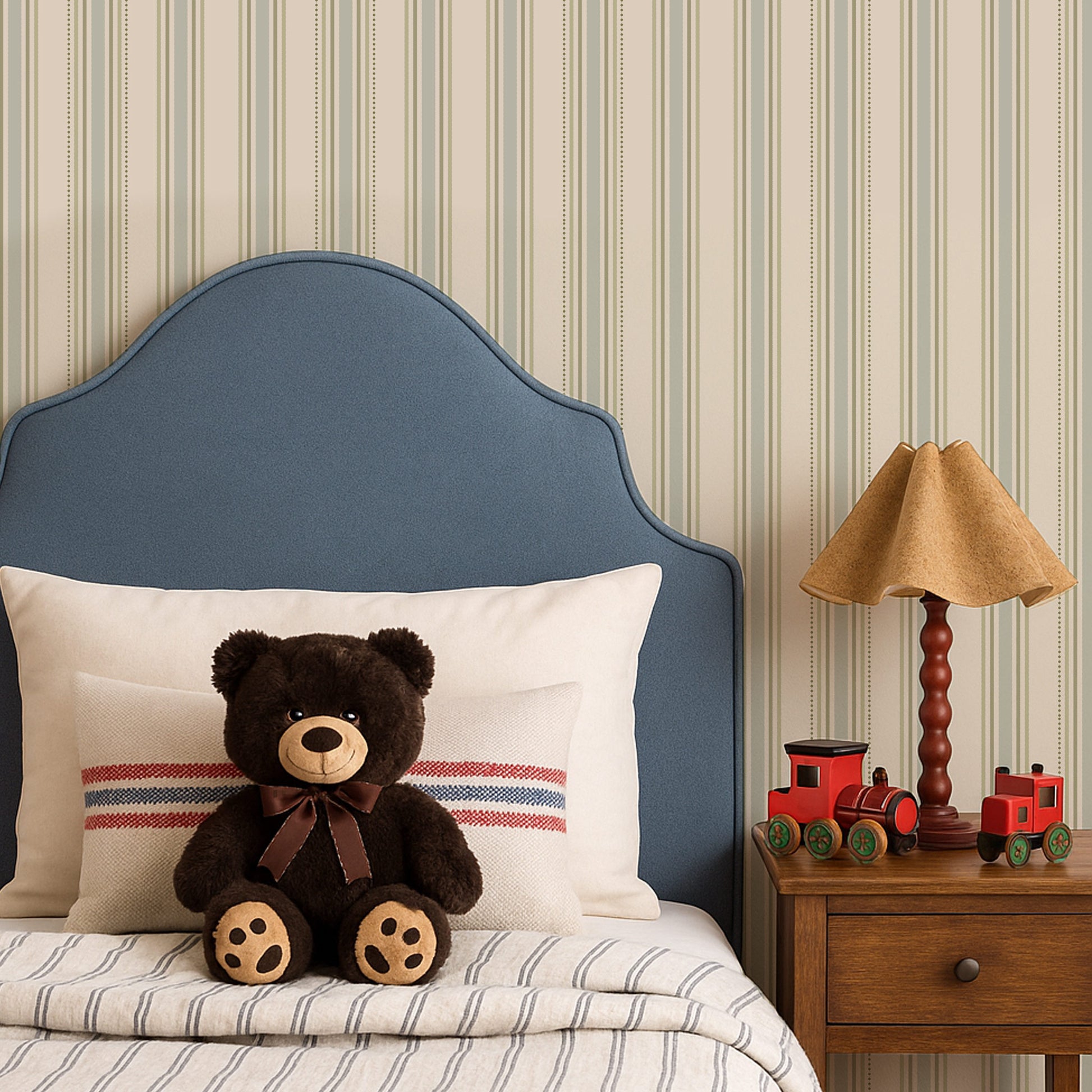 Our Coastal Stripe wallpaper range was inspired by nostalgic trips to the British seaside and vintage nautical toys. This is the perfect wallpaper if you are looking for something to grow with your child, easily transformed with different accessories and fabrics.
