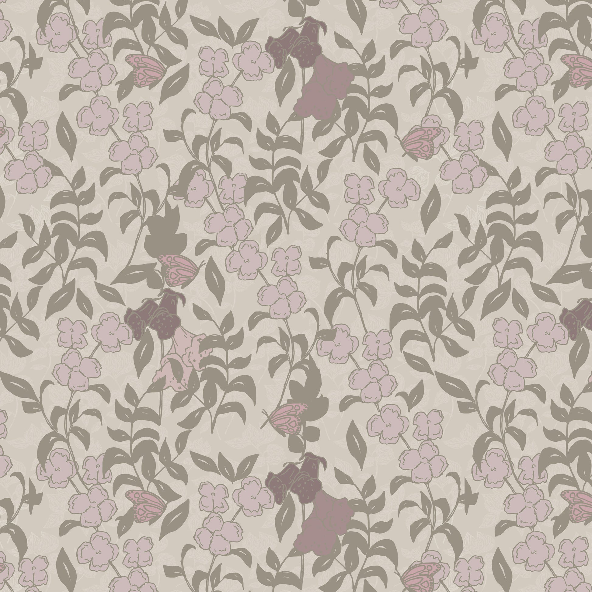 Soft pink foxgloves bloom among climbing stems, while tiny butterflies hover between petals and leaves- creating a beautifully layered, hand-illustrated pattern full of nostalgia and gentle charm.