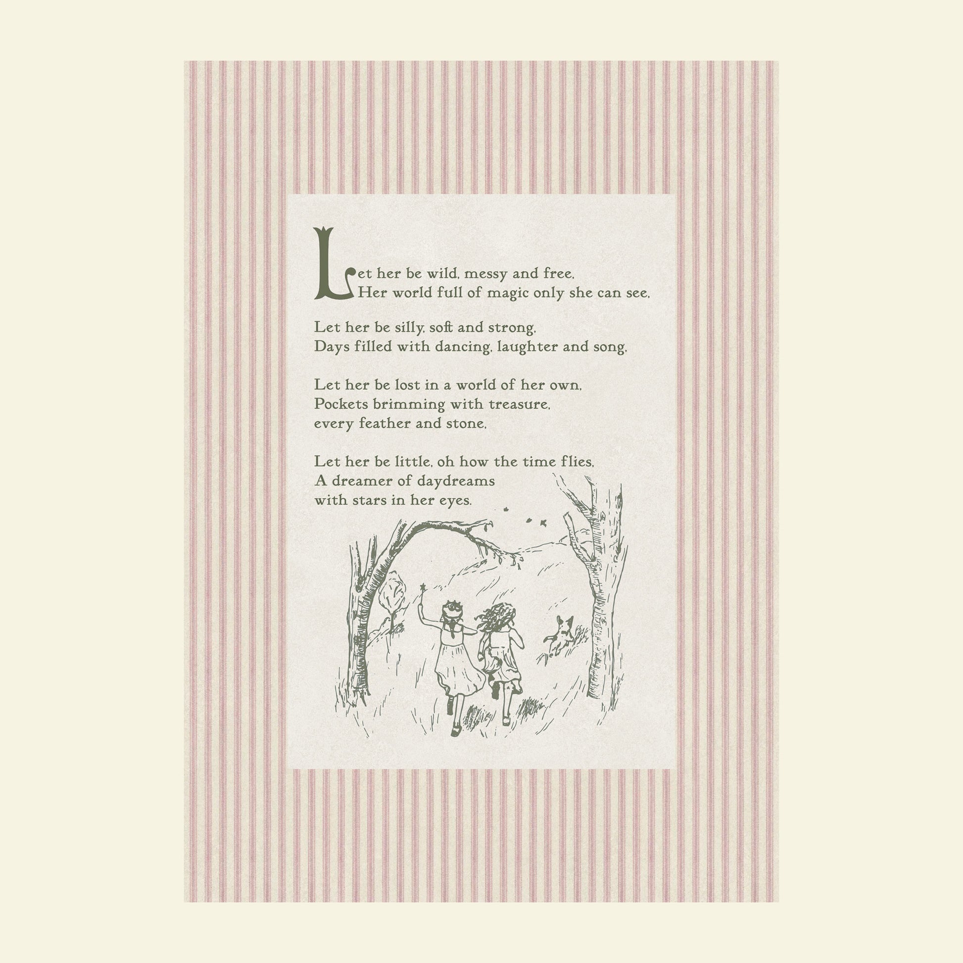 This original poem ' Let her be'' was written and illustrated by the Founder of Wildhart & Co. The print is designed in the style of a traditional storybook page to add vintage charm to any little girl's room or playroom.