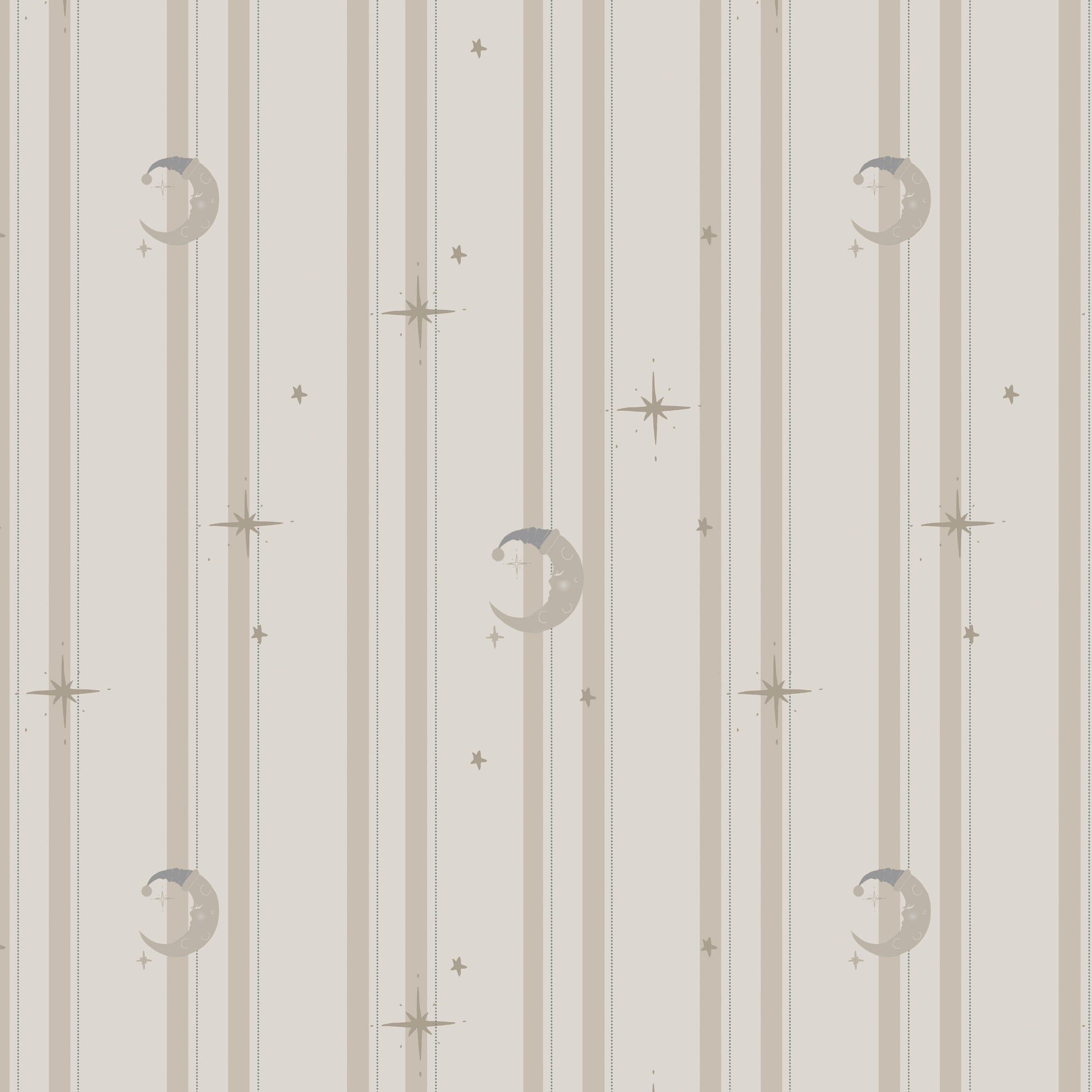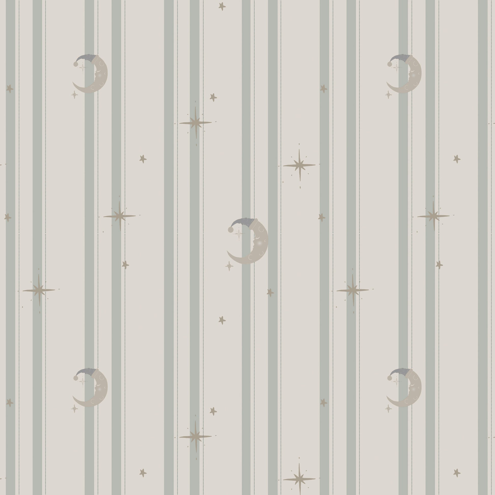 Let your little one drift off beneath a canopy of stars with our 'Man in the Moon' wallpaper. Featuring hand- illustrated moon and star motifs on a background of softly hued stripes in either a neutral tone or soft blue. This magical print is a nod to vintage nursery tales and bedtime lullabies, perfect for a calming bedroom evoking a peaceful night sky.