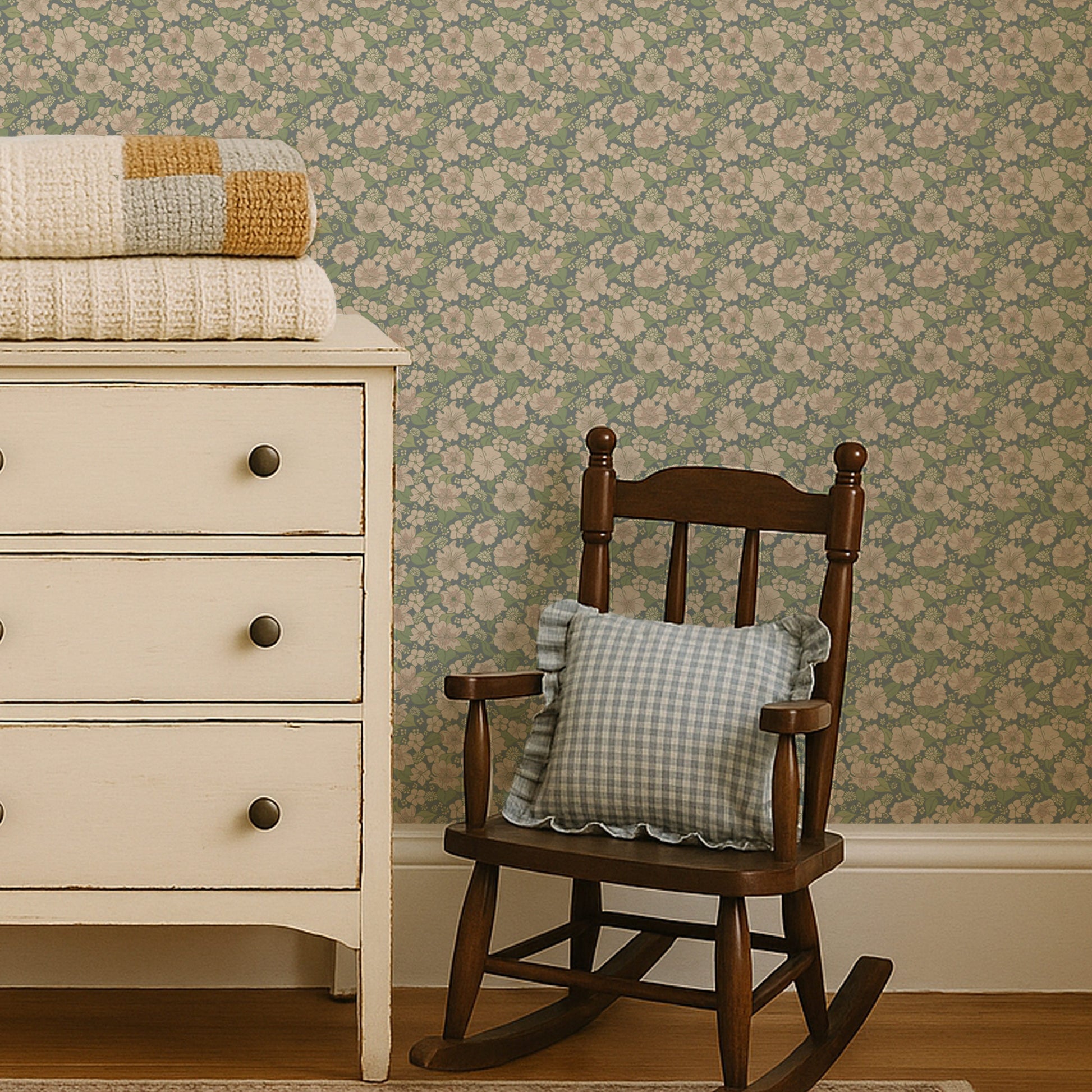 Bring a sense of timeless vintage charm to your child's bedroom (or your own) with our Meadow Bloom wallpaper. Featuring delicate hand-drawn florals in muted, aged tones. This design evokes the serenity of an English meadow in full bloom, wrapping little ones in a world that feels calm and connected to nature.
