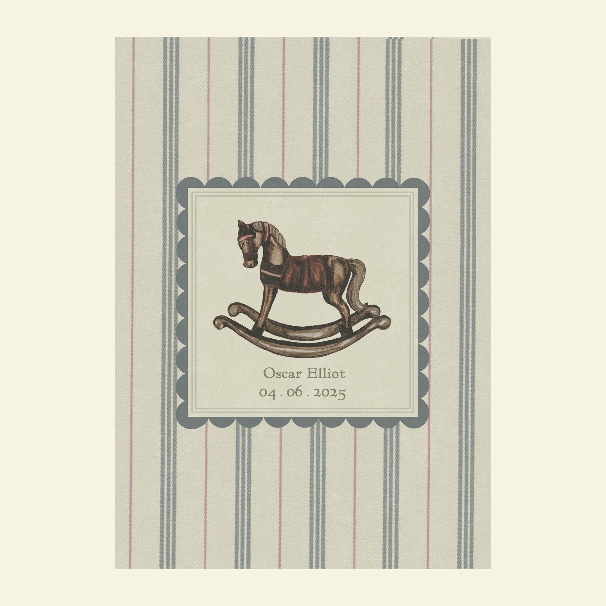 Add a personal touch to your nursery decor with this adorable hand-painted rocking horse with your child's name and date of birth. Featuring a sweet striped border and scallop detail, this art print would make a beautiful gift for a new baby.