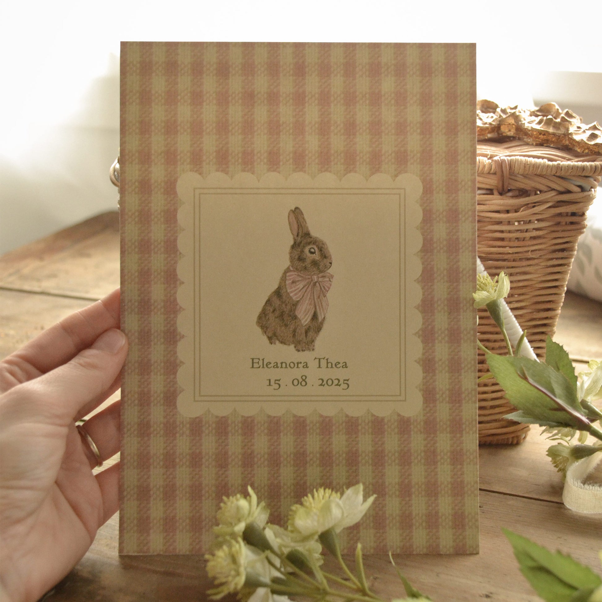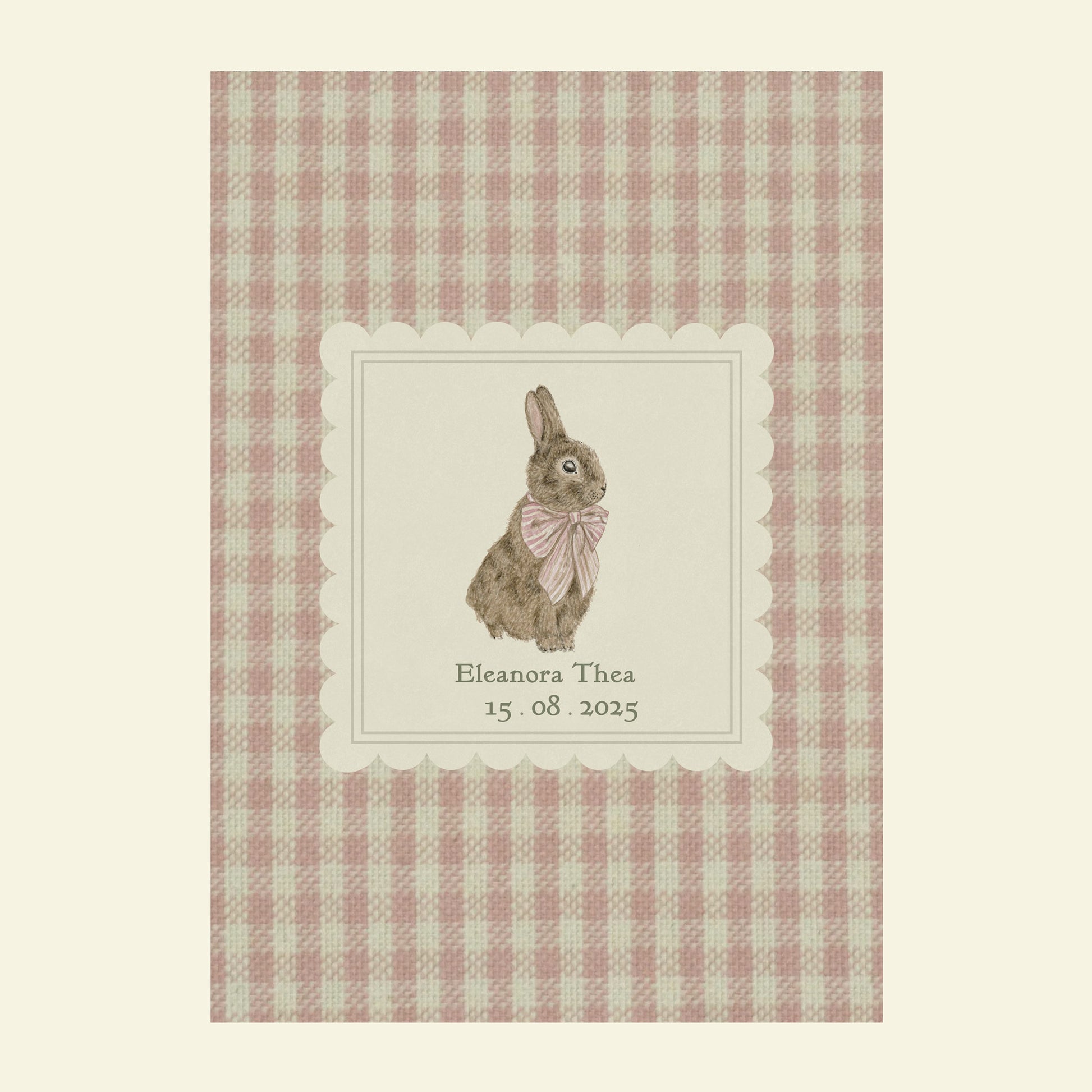 Add a personal touch to your nursery decor with this adorable hand-painted bunny with your child's name and date of birth. Featuring a sweet gingham border and scallop detail, this art print would make a beautiful gift for a new baby.