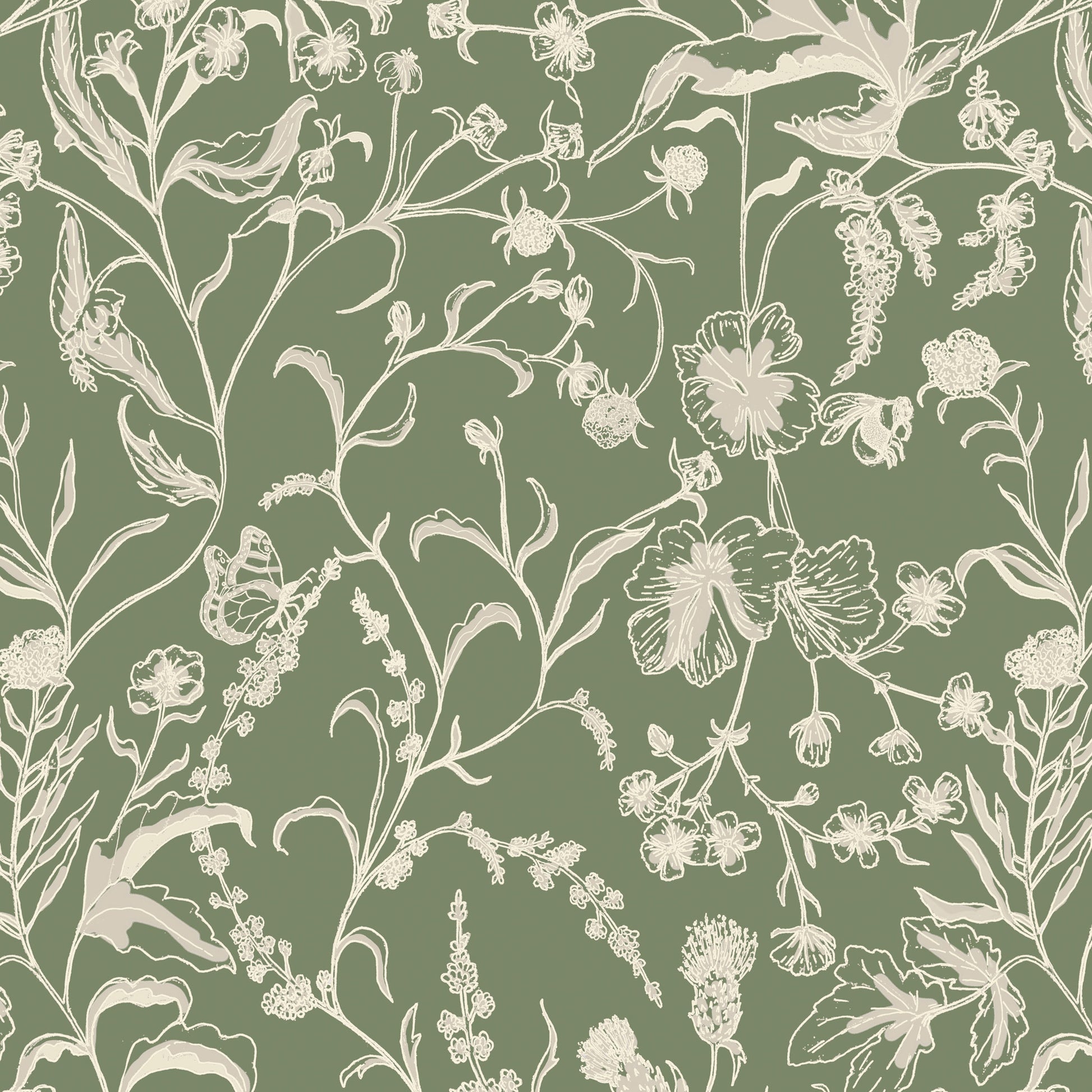 Our Wildflower Meadow Wallpaper, a hand-illustrated design capturing the delicate beauty of a countryside in bloom. Featuring trailing wildflowers, leafy stems and fluttering butterflies dancing across a soft earthy green backdrop. This wallpaper is equally beautiful for little ones and timeless enough for grown up spaces.